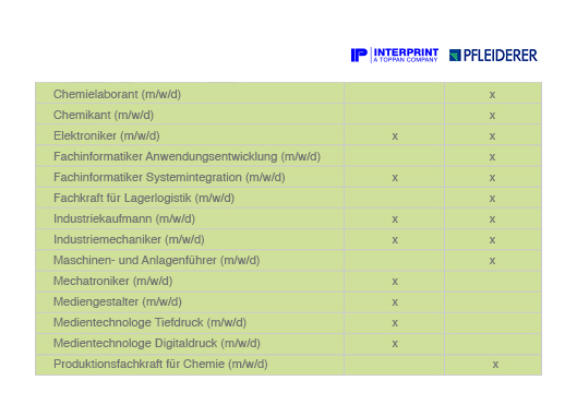 Die Pfleiderer Arnsberg GmbH bietet an ihrem Standort Ausbildungsplätze in 10 verschiedenen Berufen an.